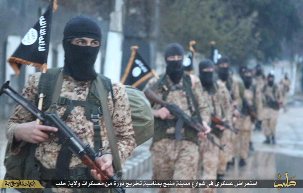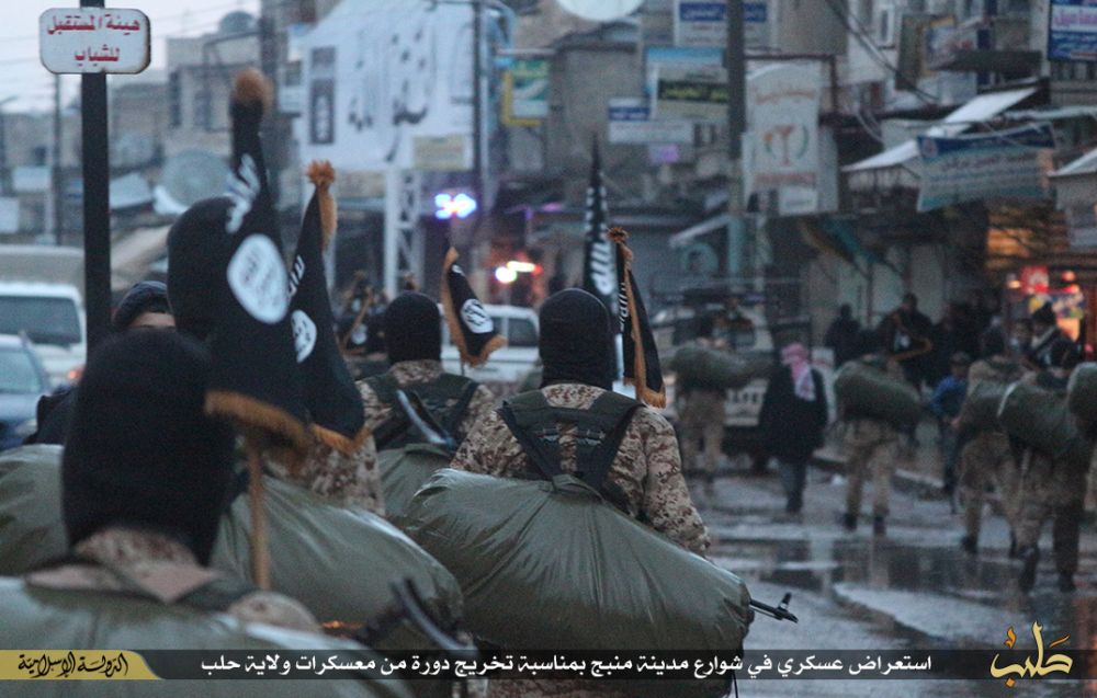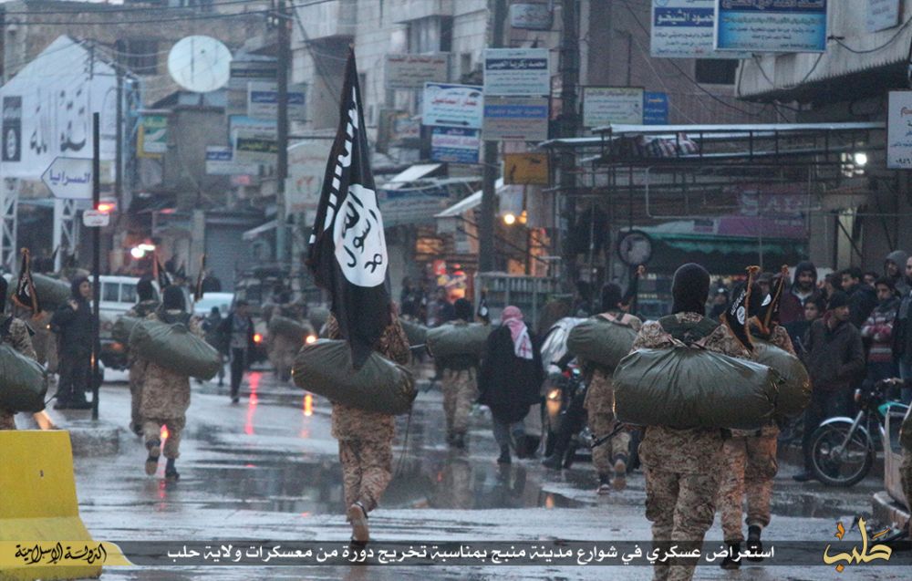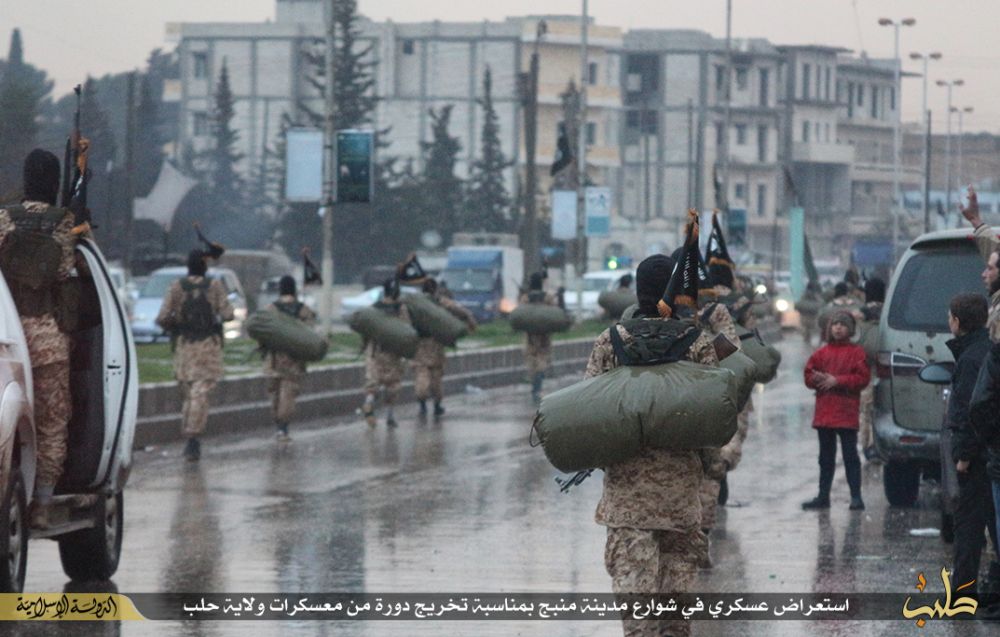 نشر تنظيم الدولة الإسلامية "داعش"، صورا لاستعراض عسكري في شوارع مدينة "منبج" في حلب بسوريا، بمناسبة تخرج دفعة جديدة من مقاتليه من معسكر المدينة.