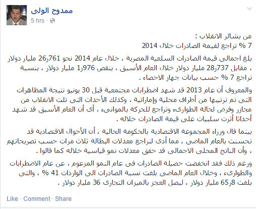 واختم الولي تدوينته بأنه علي الرغم من  ذلك فقد انخفضت حصيلة الصادرات فى عام النمو المزعوم ، عن عام الاضطرابات والطوارىء ، وخلال العام الماضى بلغت نسبة الصادرات الى الواردات 41 % ، والتى بلغت 65.8 مليار دولار ، ليصل العجز بالميزان التجارى 36 مليار دولار .