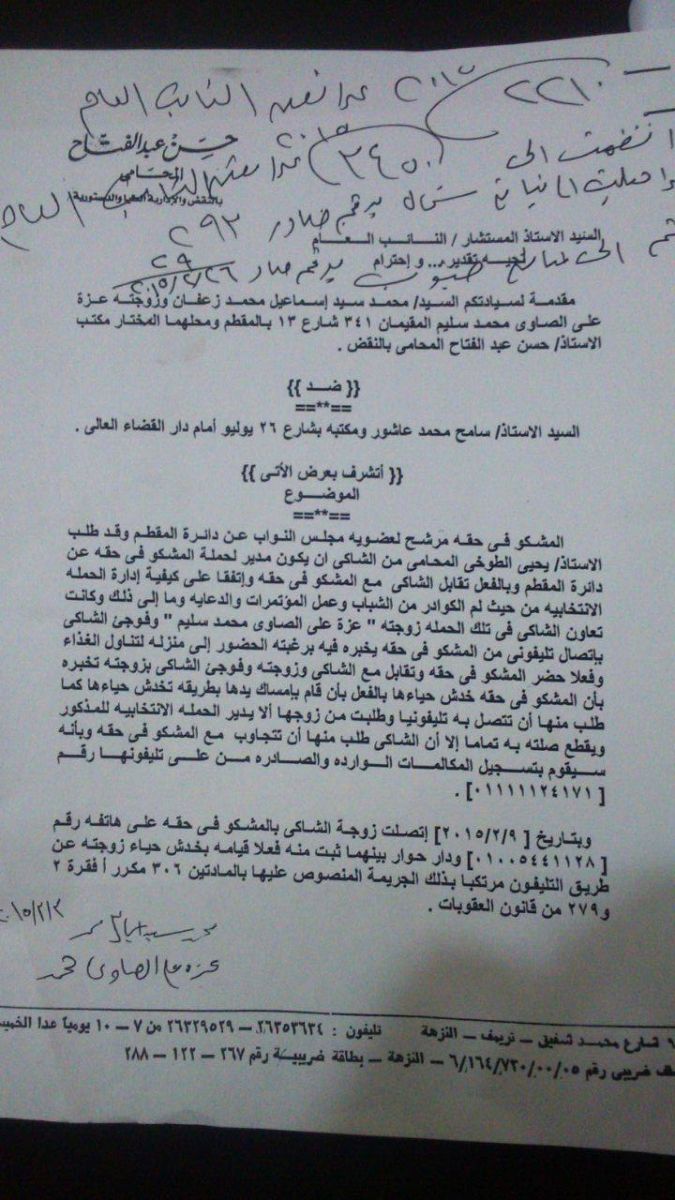 قدم محمد سيد إسماعيل، مدير الحملة الانتخابية لنقيب المحامين سامح عاشور، بلاغًا للمستشار هشام بركات النائب العام، يطالب فيه باستدعاء نقيب المحامين سامح عاشور للمثول للتحقيق في تحرشه بزوجته.