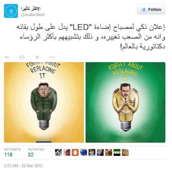 تداول رواد مواقع التواصل الاجتماعي إعلاناً لمصباح إضاءة "led"، يحمل شكلاً ساخراً للدعاية على شكل حكام ديكتاتوريين لرئيس كوريا الشمالية كيم جونغ أون، والسفاح السوري بشار الأسد.