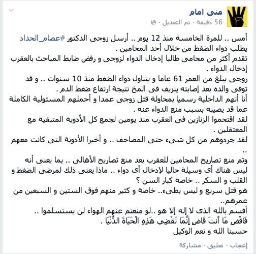 كشفت منى إمام، زوجة عصام الحداد، مسساعد الرئيس محمد مرسي للشؤون الخارجية، أن زوجها طلب دواء الضغط للمرة الخامسة، منذ 12 يومًا، عبر أكثر من محامٍ، ولكن ضابط المباحث بسجت العقرب رفض إدخال الدواء.