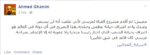 وكتب غانم خلال تدوينة له عبر صفحته على موقع "فيس بوك": "مميش: لم أقدم مشروع القناة لمرسي لأني علمت أنه لن يستمر.. وعندك واحد اعتراف خيانة عظمى وصلحه".