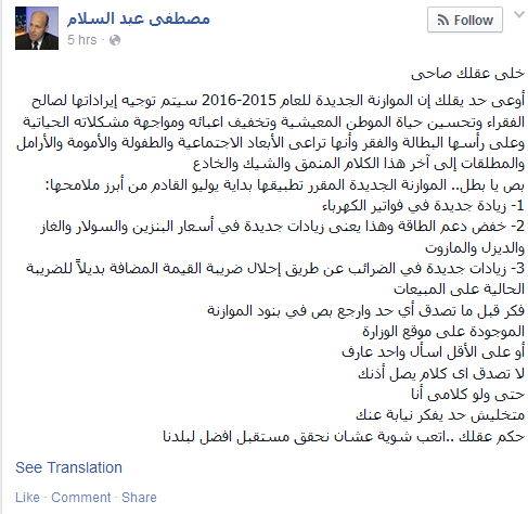 وجه مصطفى عبد السلام، الخبير الاقتصادي، عدة نصائح لمتابعيه قائلا "أوعى حد يقلك إن الموازنة الجديدة للعام 2015-2016 سيتم توجيه إيراداتها لصالح الفقراء وتحسين حياة الموطن المعيشية وتخفيف أعبائه ومواجهة مشكلاته الحياتية، وعلى رأسها البطالة والفقر، وأنها تراعي الأبعاد الاجتماعية والطفولة والأمومة والأرامل والمطلقات إلى آخر هذا الكلام المنمق والشيك والخادع".
