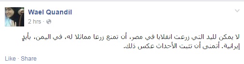 وكتب، خلال تدوينة له عبر صفحته على موقع "فيس بوك": "لا يمكن لليد التي زرعت انقلابا في مصر، أن تمنع زرعا مماثلا له، في اليمن، بأيدٍ إيرانية، أتمنى أن تثبت الأحداث عكس ذلك".