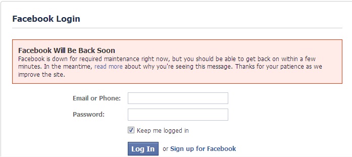 Facebook is down for required maintenance right now, but you should be able to get back on within a few minutes. In the meantime, read more about why you're seeing this message. Thanks for your patience as we improve the site.