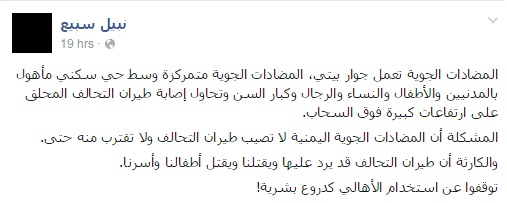 وكتب سبيع في تدوينة له عبر صفحته على موقع "فيس بوك": "المضادات الجوية تعمل جوار بيتي، المضادات الجوية متمركزة وسط حي سكني مأهول بالمدنيين والأطفال والنساء والرجال وكبار السن وتحاول إصابة طيران التحالف المحلق على ارتفاعات كبيرة فوق السحاب".