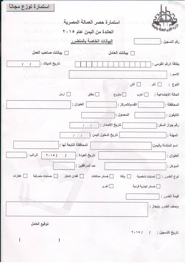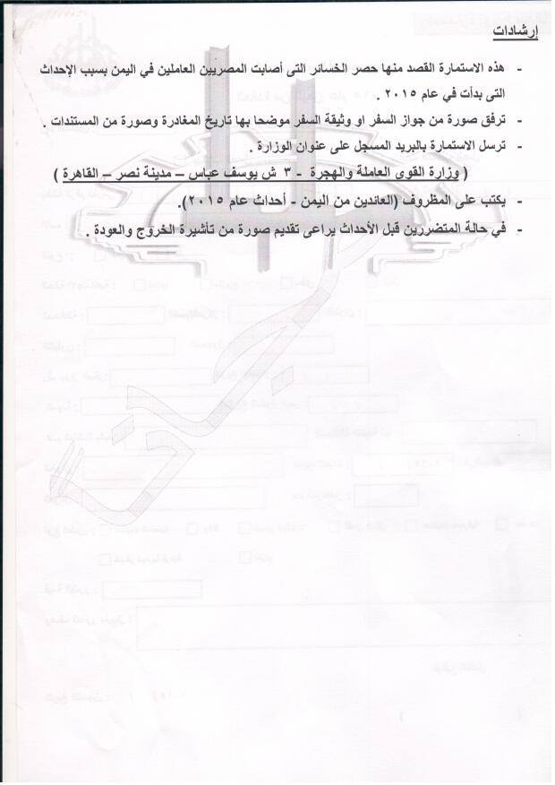 وطالبت الوزارة  المتضرر بأن يرفق مع الاستمارة صورة من جواز أو وثيقة السفر، موضحا بها تاريخ المغادرة وصورة من المستندات الدالة على خسائره، وترسل جميعها بالبريد المسجل على عنوان وزارة القوى العاملة والهجرة (3 شارع يوسف عباس – مدينة نصر- القاهرة )، ويكتب على المظروف من الخارج "العائدون من اليمن عام 2015"، وفي حالة المتضررين قبل الأحداث يراعي تقديم صورة من تأشيرة الخروج والعودة.