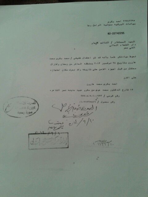 تلغراف إلى النيابة العامة حول اختطاف المتهم محمد بكري هارون في نوفمبر 2013: