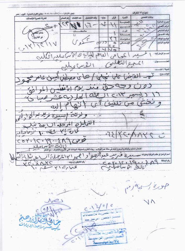 2- تلغرافات مقدمة من أسرة المتهم تفيد تعرضه للاختفاء القسري بشهر ديسمبر 2013: