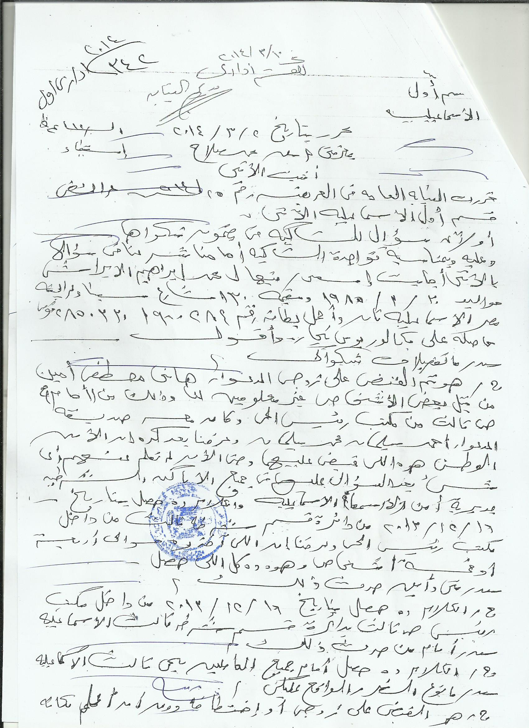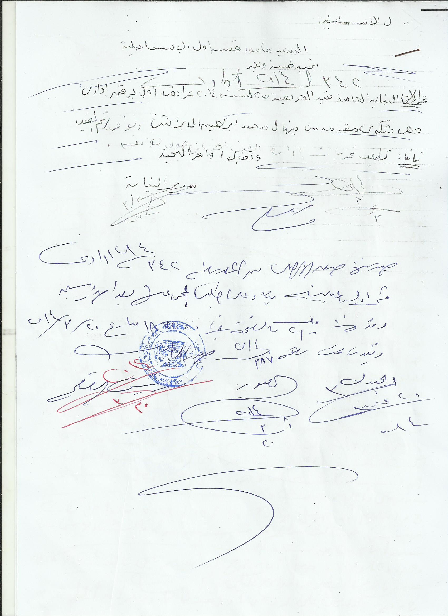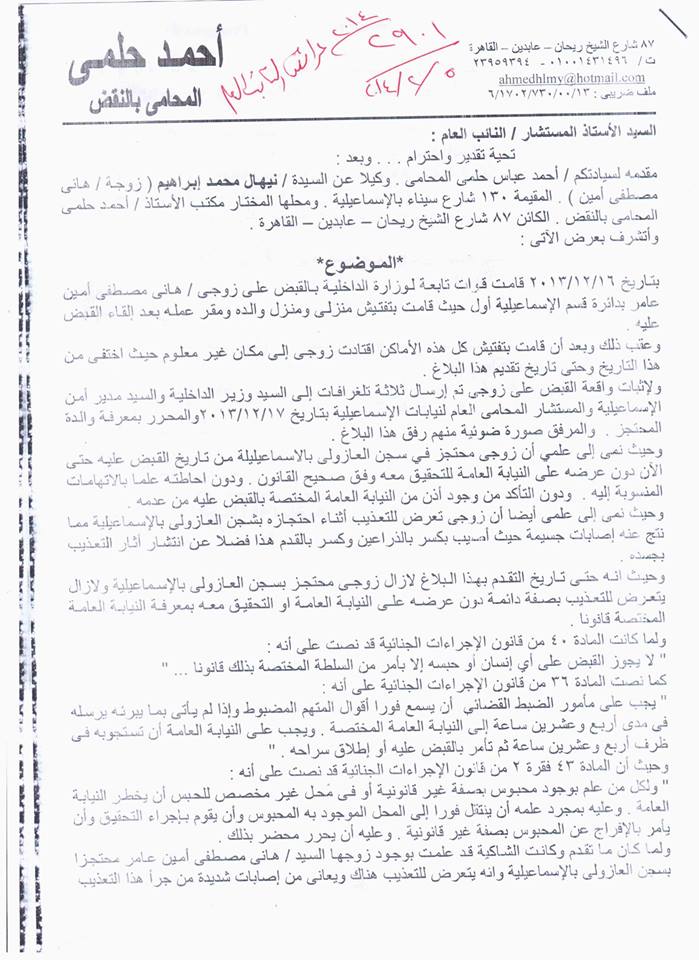 شكوى مقدمة إلى النائب العام حول تعرضه للاختفاء القسري بسجن العزولي المصري: