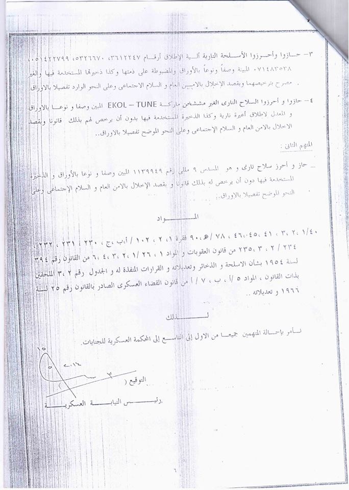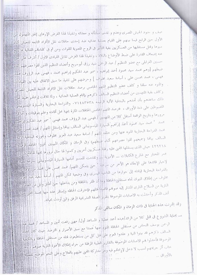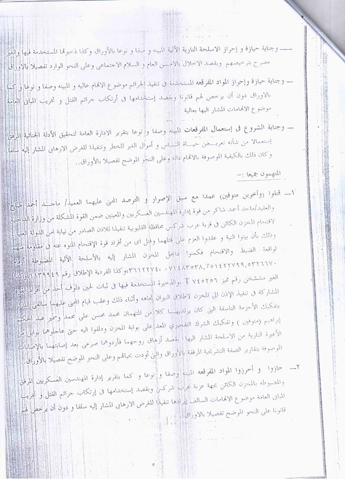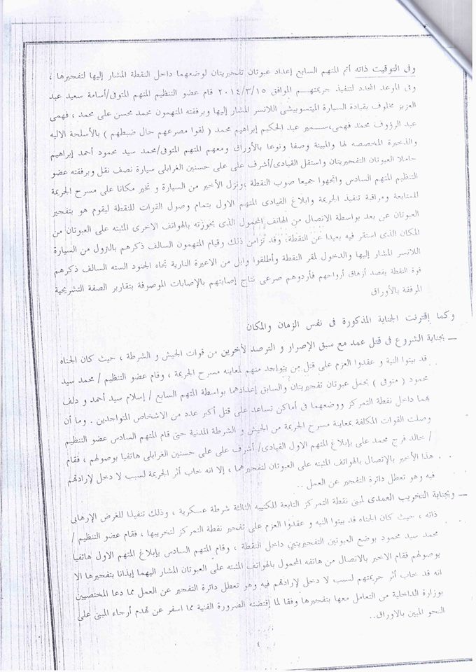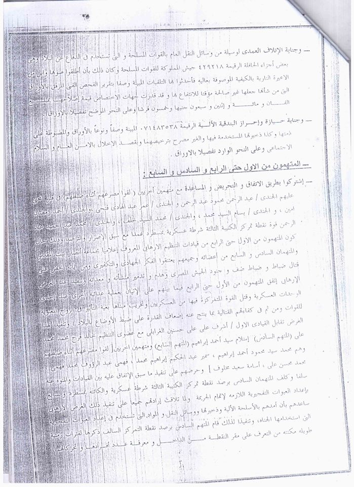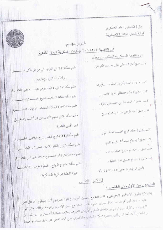وكانت النيابة العسكرية قد وجهت للمتهمين تهمة تنفيذ هجوم مسلح استهدف حافلة تقل جنود الجيش في منطقة الأميرية بالقاهرة، وأسفر عن مصرع مساعد بالقوات المسلحة في 13 مارس 2014، وقتل 6 جنود في كمين للشرطة العسكرية في منطقة مسطرد في 15 مارس 2014، وقتل ضابطين أمن بمخزن عرب شركس بتاريخ 19 مارس 2014 حال ضبطهم وفق ما قررته النيابة العسكرية.