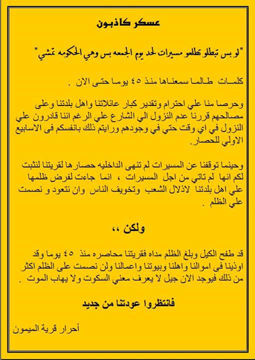 وتحت عنوان "عسكر كاذبون"، قال كل من: تحالف دعم الشرعية وأولترس أحرار وحركة أحرار الميمون إنهم أوقفوا الحراك بشكل جزئي بالقرية في ظل حصار الأمن لها رغم قدرتهم على مواصلته لمراعاة مصالح المواطنين حتى لا يتخذها الأمن ذريعة لحصاره للقرية".