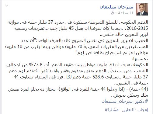 وعلّق سرحان سليمان على تصريحات وزير التموين، قائلًا إن "الحكومة تعترف بأن 70 مليون مواطن يستحقون الدعم، أي 77.8% من إجمالي الشعب، ومن يستحق الدعم يعني أنه معدوم وفقير، في المقابل تقدم لهم 37 مليار جنيه دعمًا، أي 528.6 جنيه للفرد في السنة، أي 44 جنيهًا في الشهر!".