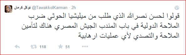 طالبت الناشطة اليمنية توكل كرمان، بإبلاغ حسن نصرالله، أمين عام حزب الله اللبناني، الذي طلب ضرب الملاحة الدولية في مضيق باب المندب، بأن الجيش المصري يؤمن الملاحة في المضيق.