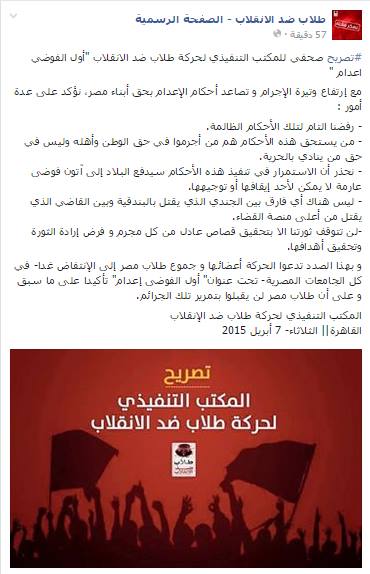 دعت حركة طلاب ضد الانقلاب أعضاءها للتظاهر غدا في كل جامعات مصر تحت عنوان "أول الفوضى إعدام"، للتنديد بأحكام الإعدام الأخيرة بحق معارضي حكم العسكر، لا سيما بعد تنفيذ أحد تلك الأحكام قبل شهر مضى، مؤكدين أن الطلاب لن يقبلوا بتمرير تلك الجرائم.