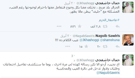وكتب خاشقجي، خلال تغريدة له على صفحته الشخصية بموقع “تويتر”: “الجزائر بلد مريح، تختلف معنا بكل وضوح فنتعامل معها باحترام لوضوحها رغم العتب، المشكلة مع حليف يبطن ما لا يظهر”، فرد عليه ساويرس في تغريدة: “عيب الكلام دا”.
