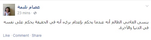 وقال في تدوينة ثانية، عبر صفحته على موقع التواصل الاجتماعي “فيس بوك”: “ينسى القاضي الظالم أنه عندما يحكم بإعدام بريء فهو يحكم في الحقيقة على نفسه في الدنيا والآخرة”.