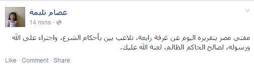 علق الداعية الإسلامي عصام تليمة على قرارات محكمة الجنايات اليوم في القضية المعروفة إعلاميًا بغرفة عمليات رابعة بقوله: "إن مفتي مصر بتقريره اليوم عن غرفة رابعة تلاعب بأحكام الشرع"