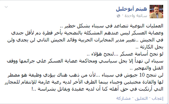 وأشار- عبر تدوينة له على موقع التواصل الاجتماعي “فيس بوك”- إلى أن العمليات النوعية ضد قوات الجيش والشرطة تتصاعد في سيناء بشكل خطير، مضيفا أن سيناء لن تهدأ إلا بحل سياسي ومحاكمة عصابة العسكر علي جرائمها ووقف القتل والتهجير .