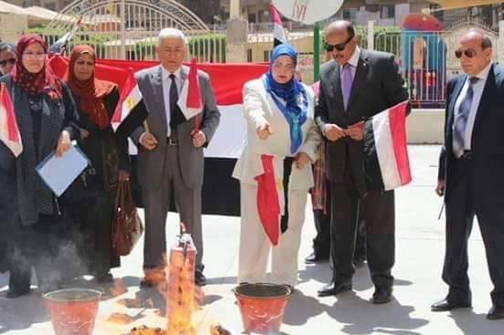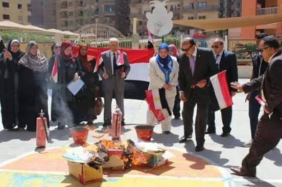 ويظهر في الصور، مديرة مديرية التعليم بالجيزة وكيلة الوزارة، ومعها مدير مدرسة “فضل الحديثة” بالجيزة، وهما يجمعان كتب التراث الإسلامي في حوش المدرسة ثم يقومان بحرقها بالكامل.