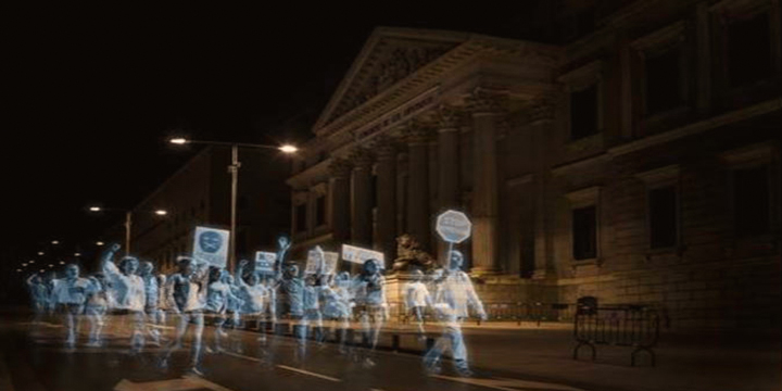 إلا أن تظاهرة هذه المرة كانت مختلفة، إذ استخدم المتظاهرون تقنية الهولوجرام ثلاثية الأبعاد، التي تُظهر الأشخاص في أماكن غير أماكن وجودهم الفعلي.