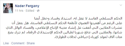 وتعليقًا على واقعة مدينة الإنتاج الإعلامي، كتب في تدوينة له عبر صفحته الرسمية على موقع “فيس بوك”: “رغم أهميتها القصوى لأنظمة الحكم التسلطي الفاسدة، هل يعقل أن عشرات الملايين التي أنفقت على إنشاء مدينة الإنتاج الإعلامي، والملايين التي تدفع شهريا لطبّالي الحكم الاستبدادي الرقعاء، لم يترك منها بضع مئات لمولد كهرباء احتياطي لحالات الطوارئ؟!”.