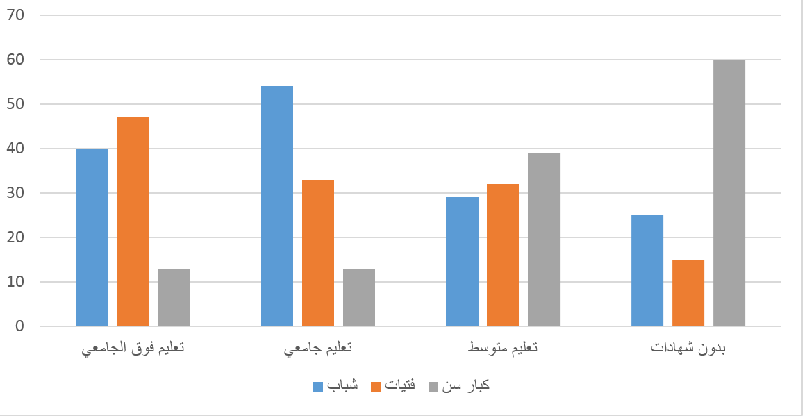 وأظهرت الإجابات أن أكثر الفئات المتابعة هي الشباب الجامعي وما فوق الجامعي وكبار السن غير المتعلمين، والرسم البياني يوضح فئات الشباب والفتيات وكبار السن من الجنسين، أيهم كان يعرفها ويتابعها بكثرة وأيهم أقل.