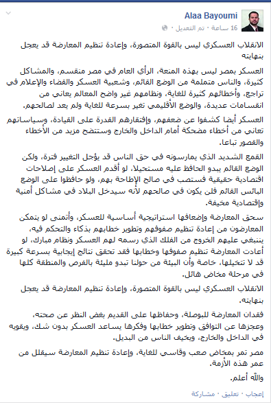 أكد الباحث السياسي، علاء بيومي، أن الإنقلاب العسكري ليس بالقوة المتصورة، وأن إعادة تنظيم المعارضة قد يعجل بنهايته، مضيفًا أن مصر تمر بمخاض صعب وقاسي للغاية، وإعادة تنظيم المعارضة سيقلل من عمر هذه الأزمة.