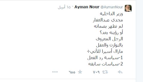 الدكتور أيمن نور، زعيم حزب غد الثورة، قال إن ما حدث من بعض أجهزة الإعلام نصف الحكومية غير المستقلة يمكن وصفه بأنه عودة الوعي المتأخر بحقيقة أفعال كان ينبغي إدانتها أولا بأول وليس وفقا لإرادة سياسية تشير بمثل هذا الهجوم وتأذن به تمهيدا لاجراءات أوخطوات أوقرارات وشيكة.