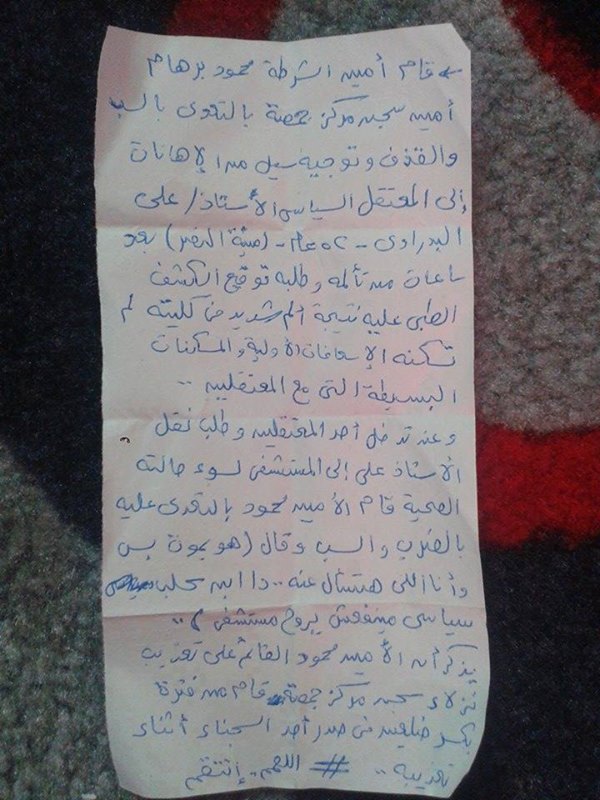 وكشفت الرسالة، باعتداء أمين الشرطة محمود برهام،  بالسب والقذف على المعتقل السياسي، على البدراوي “52 عاماً” من منية النصر، المريض بالكلي بعد إصابته بوعكة صحية شديدة ورفض نقله إلى المستشفي للعلاج، قائلاً: “هو يموت بس وأنا اللى هتسأل عنه.. ده ابن كلب سياسي مينفعش يروح مستشفى”.