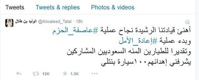 نشر رجل الأعمال السعودي، الأمر الوليد بن طلال بن عبدالعزيز آل سعود، مساء أمس، تغريدة على موقع التدوينات القصيرة “تويتر”، هنأ فيها القيادة السعودية بـ”نجاح عاصفة الحزم”، معلنًا تقديمه مئة سيارة فارهة كهدية للطيارين السعوديين المشاركين في العملية، إلا أن التغريدة حذفت، ما تسبب في إثارة التساؤلات.