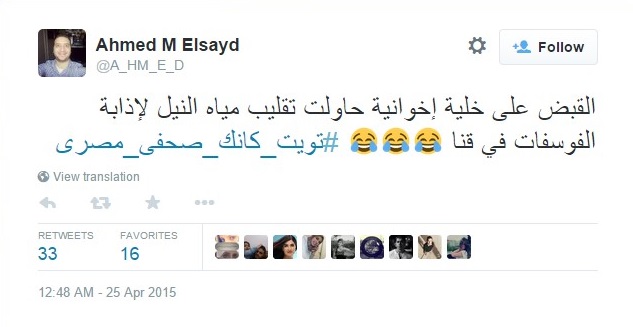 وعلق أحمد السيد :”القبض على خلية إخوانية حاولت تقليب مياه النيل لإذابة الفوسفات في قنا”.
