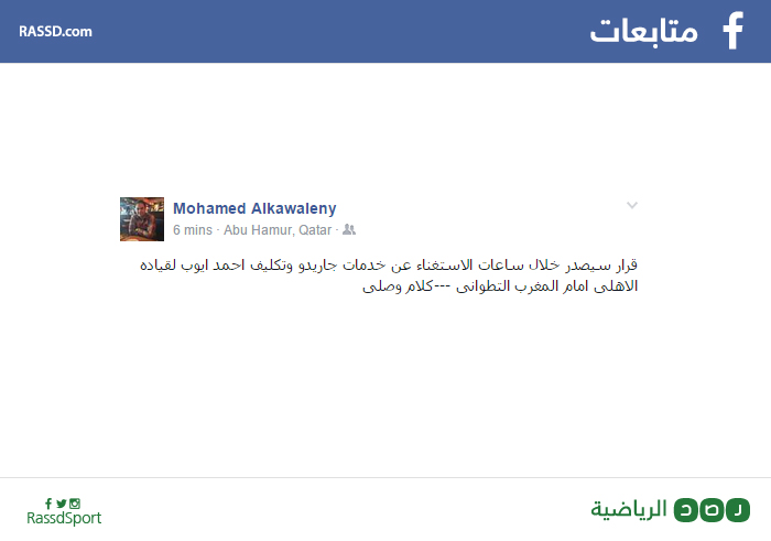 وقال الكواليني، عبر صفحته الشخصية على موقع التواصل الاجتماعي “فيس بوك”، إن “قرارا سيصدر خلال ساعات بالاستغناء عن خدمات جاريدو، وتكليف أحمد أيوب بقيادة الأهلي أمام المغرب التطواني، كلام وصل لي”، يأتي ذلك بعد تصريحات لرئيس نادي الأهلي، محمود طاهر، أكد خلالها عدم وجود نية للاستغناء عن جاريدو قبل نهاية الموسم.
