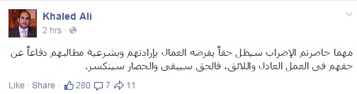 وقال “علي”، خلال تدوينة له عبر صفحته الرسمية على موقع “فيس بوك”، إنه “مهما حاصرتم الإضراب سيظل حقًا يفرضه العمال بإرادتهم وبشرعية مطالبهم دفاعًا عن حقهم في العمل العادل واللائق، فالحق سيبقى والحصار سينكسر”.