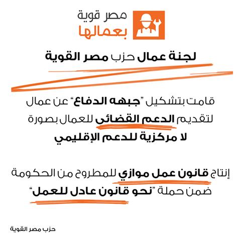 أعلن حزب مصر القوية عن تشكيل لجنة العمال في الحزب لجبهة دفاع عن العمال لتقديم الدعم القضائي بصورة لا مركزية للدعم الإقليمي.