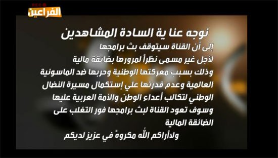 قالت قناة "الفراعين" إن بث برامجها توقف إلى أجل غير مسمى، نظرًا لمرورها بضائقة مالية بسبب المعركة الوطنية ضد ما أسمته بـ"الماسونية العالمية"، وعدم قدرتها على استكمال مسيرة النضال الوطني لتكالب أعداء الوطن والأمة العربية عليه
