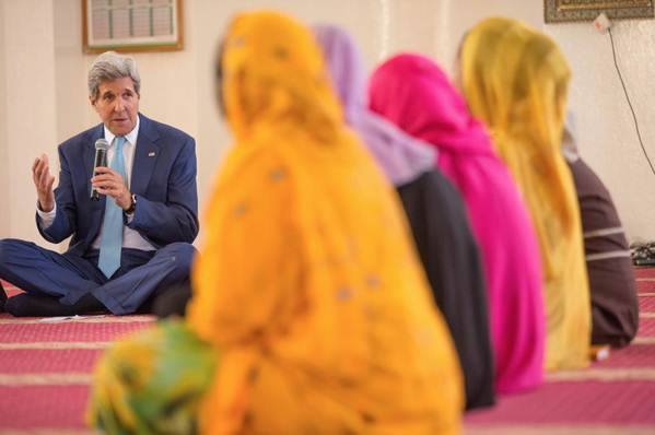 تداول مغردون ونشطاء على موقع التواصل الاجتماعي صورًا لوزير الخارجية الأمريكي، جون كيري، داخل أحد المساجد بجيبوتي، وحوله مجموعة من المسلمين، قالوا إنه يخبرهم كيف يكون الإسلام الوسطي.