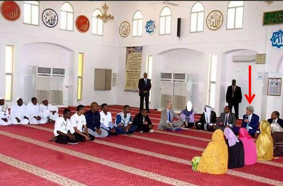 تداول نشطاء على موقع التواصل الاجتماعي صورا لوزير الخارجية الأمريكي، جون كيري، داخل أحد المساجد بجيبوتي، وحوله مجموعة من المسلمين، قالوا إنه يخبرهم كيف يكون الإسلام الواسطي.