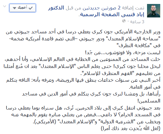 فيما علق، الداعية الأردني، إياد قنيبي، بقوله ” ليست مزحة، ولا فوتوشوب…عن جَد!”، ..وزير الخارجية الأمريكي جون كيري يعطي درسًا في أحد مساجد جيبوتي عن “سماحة الإسلام المعتدل” ودور جيبوتي- التي تضم قاعدة أمريكية ضخمة- في “مكافحة التطرف.