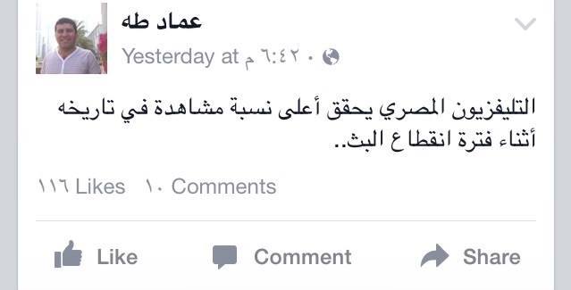 وعّلق الإعلامي عماد طه، في منشور عبر صفحته على موقع تويتر قائلا-“التلفزيون المصري يحقق أعلى نسبة مشاهدة في تاريخه أثناء فترة انقطاع البث”.