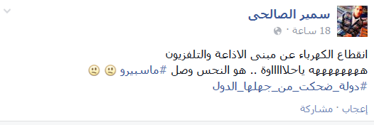 وعلق سمير الصالحي قائلا “انقطاع الكهرباء عن مبنى الاذاعة والتلفزيون ههههههههه ياحلاااااوة .. هو النحس وصل ‫‏ماسبيرو.. ‏دولة ضحكت من جهلها الدول”.