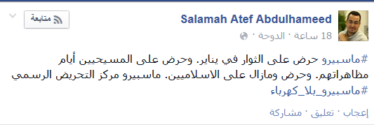 فيما علق Salamah Atef Abdulhameedt قائلا “‏ماسبيرو حرض على الثوار في يناير. وحرض على المسيحيين أيام مظاهراتهم. وحرض ومازال على الاسلاميين. ماسبيرو مركز التحريض الرسمي ‫‏ماسبيرو بلا كهرباء”.