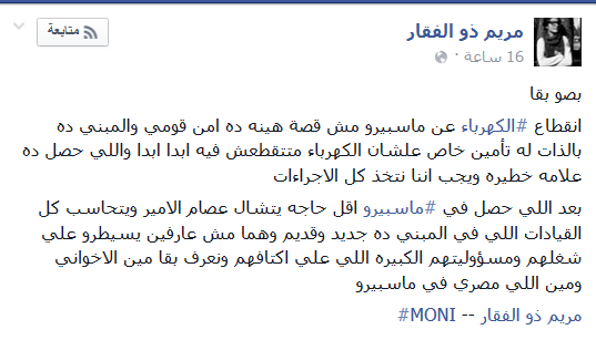 وطالبت مريم ذو الفقار، بضرورة إقالة عصام الأمير من منصبه، إذ تقول “بصو بقا، انقطاع ‫‏الكهرباء عن ماسبيرو مش قصة هينة ده أمن قومي، والمبنى ده بالذات له تأمين خاص علشان الكهرباء متتقطعش فيه ابدا ابدا، واللي حصل ده علامة خطيرة ويجب اننا نتخذ كل الإجراءات.
