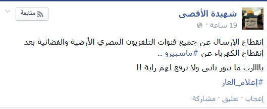 وقالت شهيدة الأقصى “انقطاع الإرسال عن جميع قنوات التلفزيون المصري الأرضية والفضائية بعد انقطاع الكهرباء عن ‫ماسبيرو .. ياااارب ما تنور تانى ولا ترفع لهم راية !!”