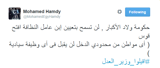 وقال Mohamed Hamdy “حكومة ولاد الأكبار، لن تسمح بتعيين إبن عامل النظافة افتح قوس (أى مواطن من محدودي الدخل لن يقبل فى أى وظيفة سيادية )”.