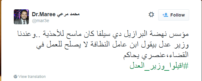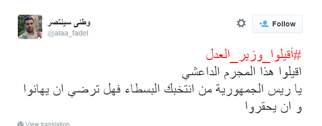 دشن عدد من مستخدمي موقع التواصل الاجتماعي "تويتر"، هاشتاج تحت عنوان "أقيلوا وزير العدل"، صباح اليوم الإثنين، عقب تصريحات وزير العدل التليفزيونية، مساء الأحد، والتي قال فيها "ابن عامل النظافة لا يمكن أن يصبح قاضيًا أو يعمل بمج
