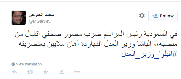 وقال محمد الجارحي “في السعودية رئيس المراسم ضرب مصور صحفي اتشال من منصبه، الباشا وزير العدل النهاردة أهان ملايين بعنصريته”.
