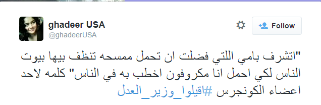 فيما ألمحت ghadeer USA إلى قول أحد أعضاء كونجرس قائلة “أتشرف بأمي التي فضّلت أن تحمل ممسحة تنظف بيها بيوت الناس لكي أحمل أنا ميكروفونًا أخطب به في الناس” كلمه لأحد أعضاء الكونجرس”.