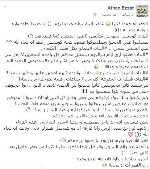 وكشفت أفنان عزت، صديقة الفتيات، عن أنهن يتعرضنّ لأبشع أنواع الانتهاكات، وأنهن ظللن أربعة أيام يتم التحقيق مع كل واحدة منهن مدة لا تقل عن خمس ساعات بعبارات بذيئة، مؤكدة أن أسماء الضباط الذين تولوا التحقيقات معلومة.