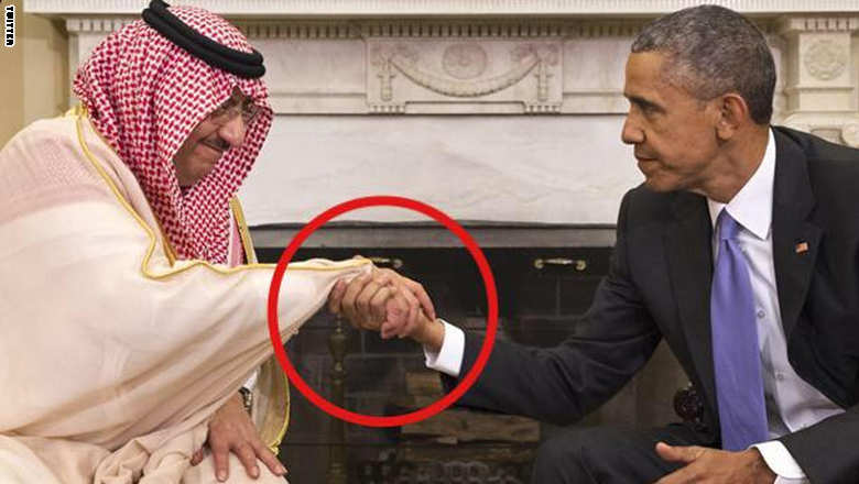 أثارت طريقة مصافحة ولي العهد السعودي محمد بن نايف، للرئيس الأميركي باراك أوباما، ضجة على موقع التواصل الاجتماعي “تويتر”، بعد أن أظهرت الصورة أن اليد العليا في المصافحة هي للسعودية، وهي صورة نشرتها وسائل الإعلام مع وضع دائرة حمراء على اليدين وقت المصافحة.